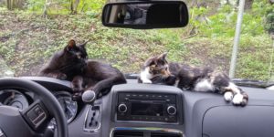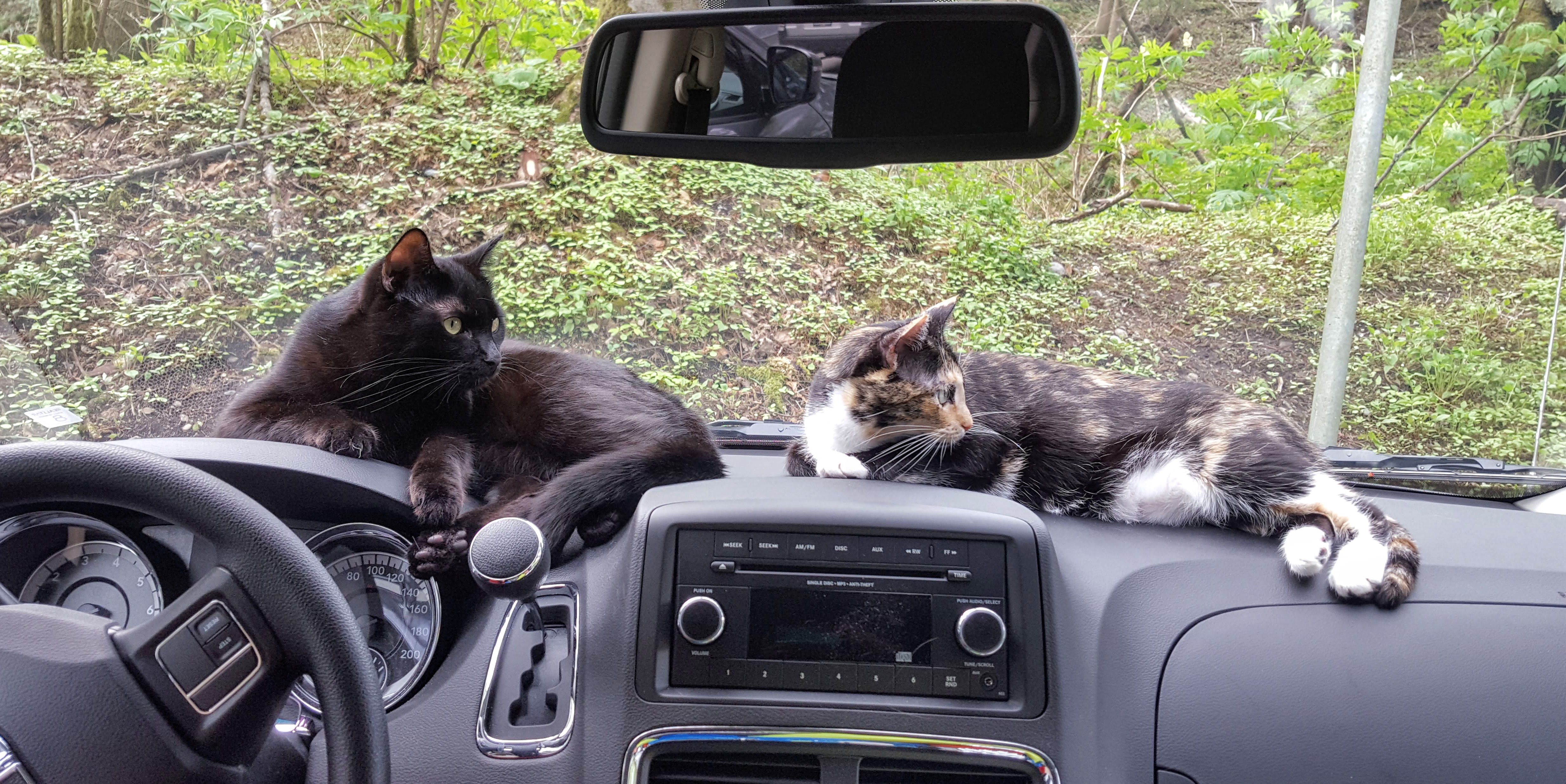 The kittens are doing well on the second day. They are less shy, more interested in what’s going on around them as we drive down the street, and even little Mystery is feeling more lovable and is purring louder. She is getting bolder about coming out from under the bed and hanging out with me. So I think it’s going to be a much easier day for all of us today.
